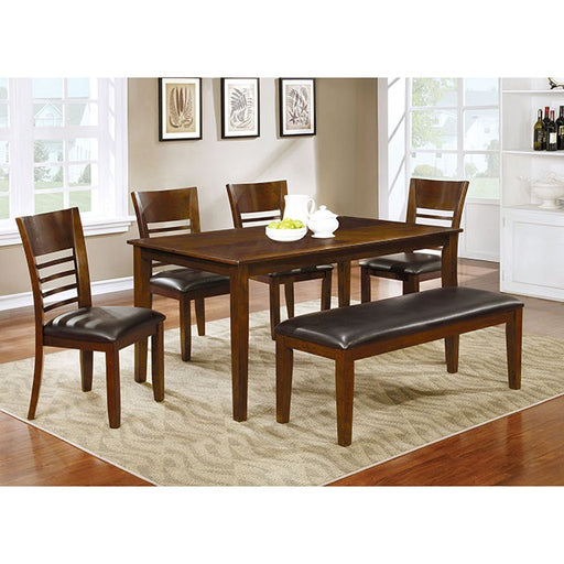View full detailsFinished in dark cherry, this bold and sturdy dining set with expandable leaf is a favorite among home owners. With padded leatherette chairs and a...