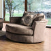 Bonaventura Brown Swivel Chair, 58" L X 58"W X 38"H, 125lbs. This set tells guests that you know how to balance form and comfort. The soothing microfiber upholstering is velvet soft; the chocolaty color is calming, and the included throw pillows add a chic patterned flair to the ensemble. Give your friends and family a soothing place to gather around and loosen up. Features: Transitional Brown Microfiber, Solid Wood Frame T-Cushion Seating Flared Arms Fitted Back Pillows Swivel Design Pillows Included